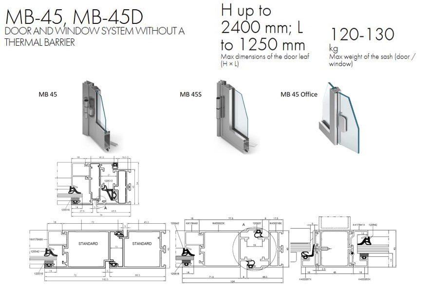 MB-45 profiili lengi sügavus ja ukselehe paksus on 50 mm ning kasutatakse siseustel.