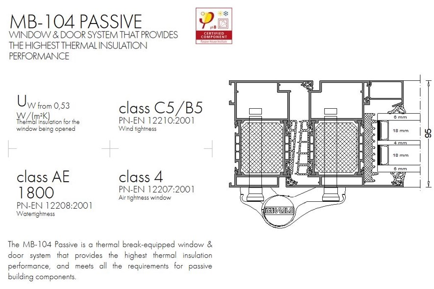 MB-104 profiil on külmakatkestusega – sisemine ja välimine terasosa on teineteisest termiliselt eraldatud, lengi sügavus ja ukselehe paksus on 95 mm ning kasutatakse välisustel.