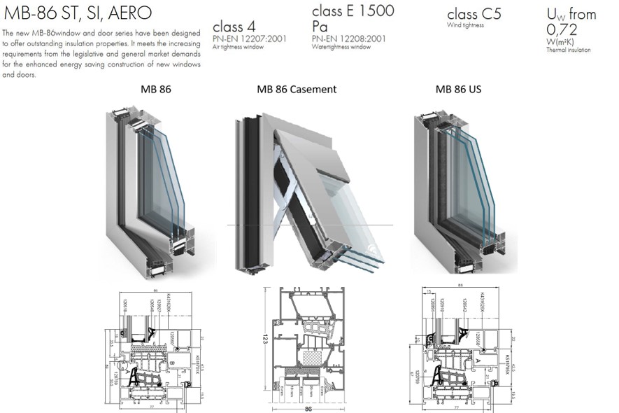 MB-86 profiil on külmakatkestusega – sisemine ja välimine terasosa on teineteisest termiliselt eraldatud, lengi sügavus ja ukselehe paksus on 77 mm ning kasutatakse välisustel.